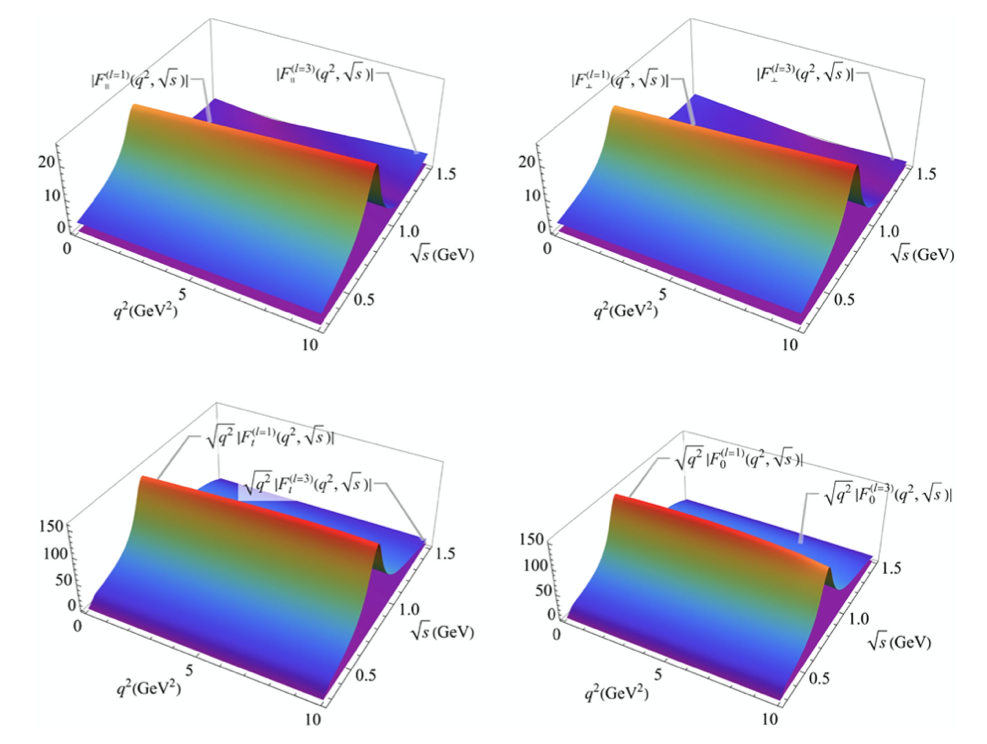 针对此需求,物理与微电子科学学院副教授程山提出采用两介子光锥分布振幅来描述重强子衰变过程中不稳定强子的QCD动力学结构,率先在高扭度水平实现了对两π介子系统的准确描述,改变了两介子分布振幅(2πDAs)研究自1998年提出 [Mdiehl, T. Gousset, B. Pire and O. Teryaev, Phys. Rev. Lett . 81, 1782 (1998)] 后长期停留在领头扭度的状况。基于高准度的2πDAs,人们可以有效分离ππ谱中共振态和非共振态贡献、准确理清共振态的宽度效应和不同分波的绝对贡献。现象学上,2πDAs是计算重介子衰变到轻介子对形状因子(B→ππ,图)的关键输入,高精度的QCD计算为通过重介子四体半轻衰变来测量Cabibbo-Kobayashi-Maskawa矩阵元|Vub|提供了理论保障,进而为解决粒子物理中备受关注的|Vub|测量疑难问题提供了新方案。